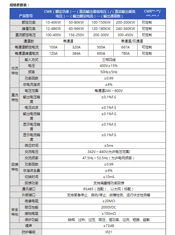 描述: CWR系列可編程高精度智能雙向直流電源,其直流輸出特性具有完全電氣隔離、高精度、高動態(tài)響應(yīng)及高可靠性等特性,并具有智能雙向能量轉(zhuǎn)換和可向電網(wǎng)回饋能量功能,DC/DC側(cè)采用載波移相電路,全數(shù)字控制,調(diào)節(jié)精度高,響應(yīng)速度快,輸出調(diào)節(jié)范圍廣。輸出具有可編程功能,可適用于新能源汽車行業(yè)的驅(qū)動電機(jī)、電機(jī)控制器、PCS(儲能電池組)和雙向充電機(jī)的測試及老化供電等。